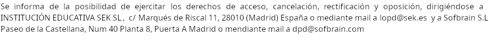 En virtud de lo estipulado en la Ley Orgánica 3/2018, de 5 de diciembre, de Protección de Datos Personales y garantía de los derechos digitales, Sofbrain S. L. y INSTITUCIÓN EDUCATIVA SEK SL informa de la existencia de ficheros automatizados de datos de carácter personal, debidamente inscritos en el Registro de la Agencia Española de Protección de Datos.